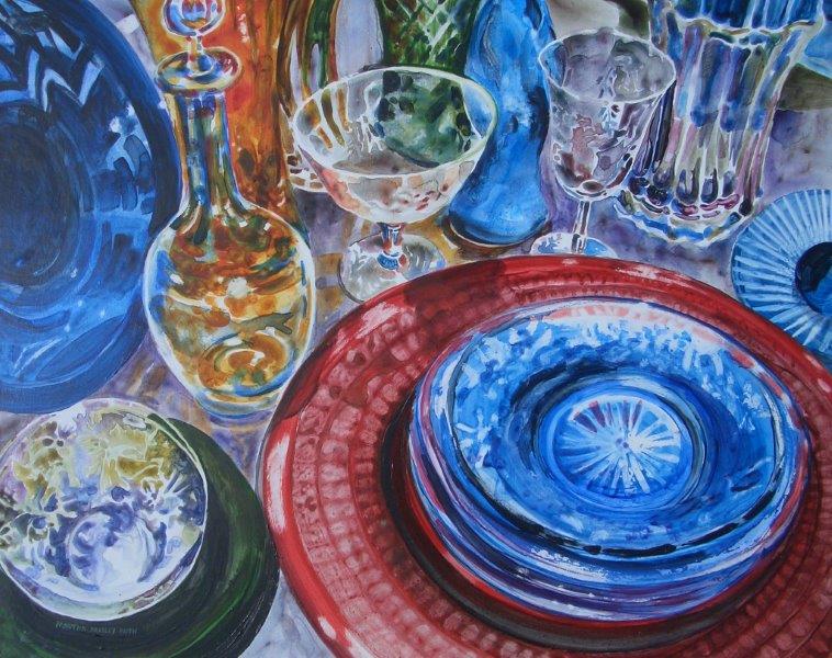 On April 16, 2009 for the Highland Arts Guild in Marble Falls, Texas Martha demonstrated her technique of painting transparent glassware in a fluid watercolor style using acrylic paint on a hardboard surface coated with gesso and acrylic medium. This gives the look of transparent watercolor without the need for mat and glass or Plexiglas!