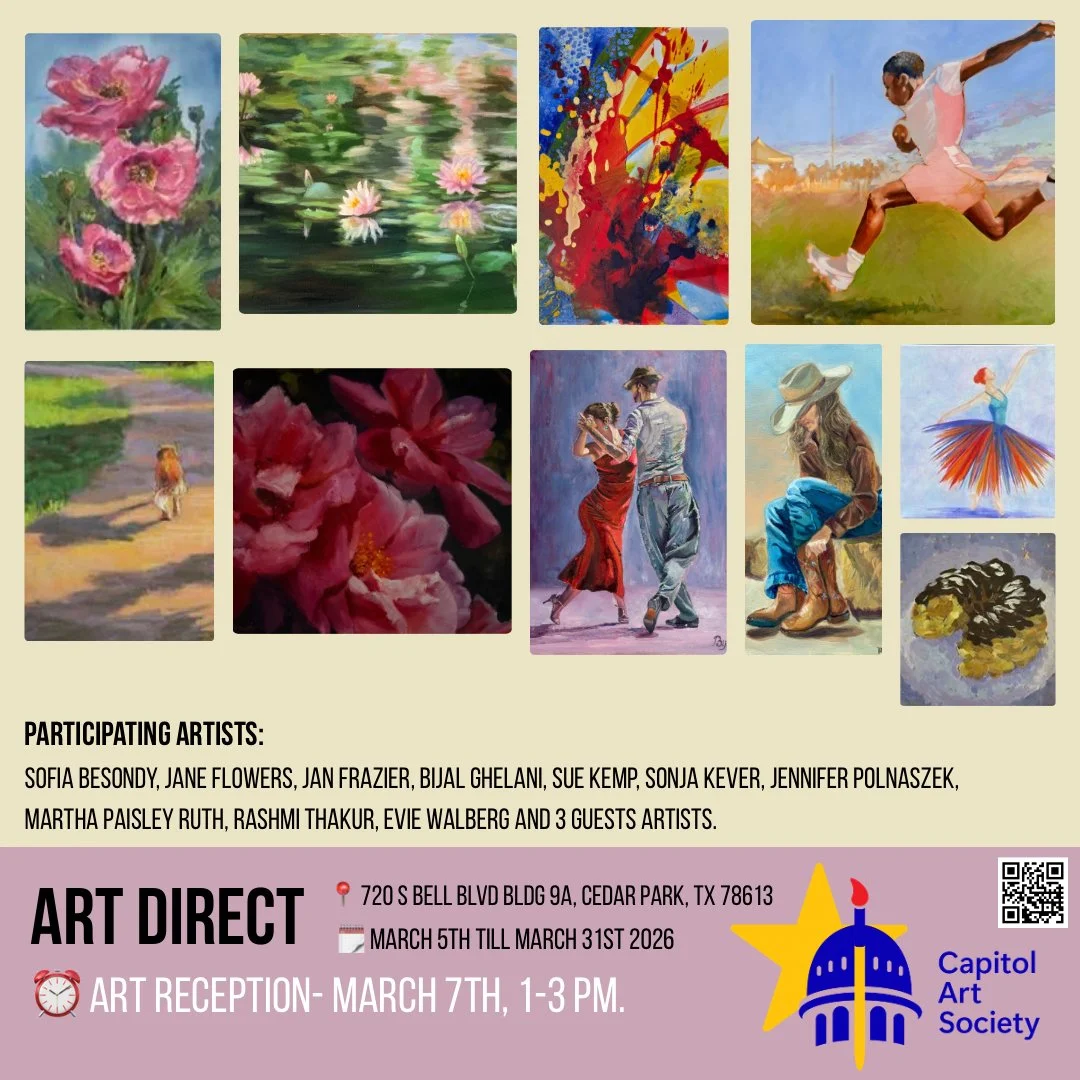 RECEPTION: Saturday, March 21, 2026, 1:00 - 3:00pm. Meet the Artists for fun conversation, music, wine, water, and finger foods! Please Click the link below, and then click "Reserve a Spot" on the right side of the page. This way they will have a headcount for our event. Share with your family, friends and neighbors! https://www.eventbrite.com/e/gallery-social-meet-capitol-art-society-tickets-1983815396253?aff=oddtdtcreator